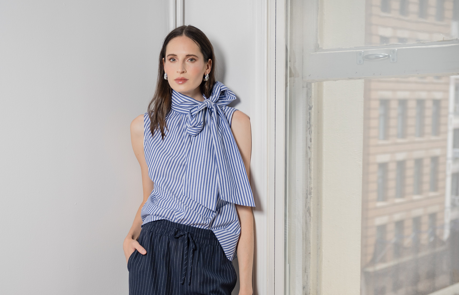 Tie-neck design with nautical stripes, combining playfulness and polish.