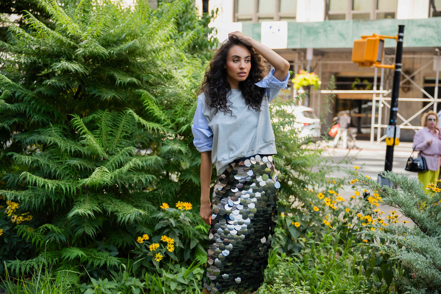 Paillette skirt with 3/4 length and fully lined for refined comfort.
