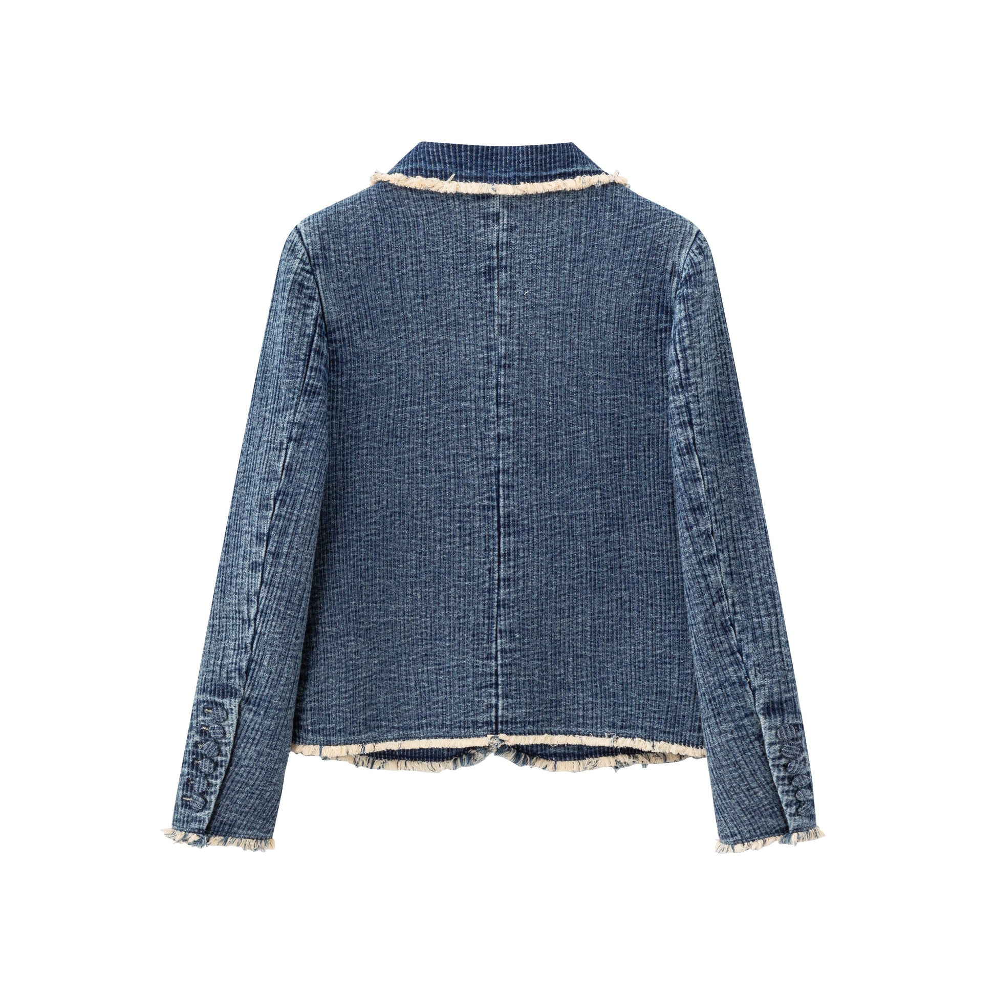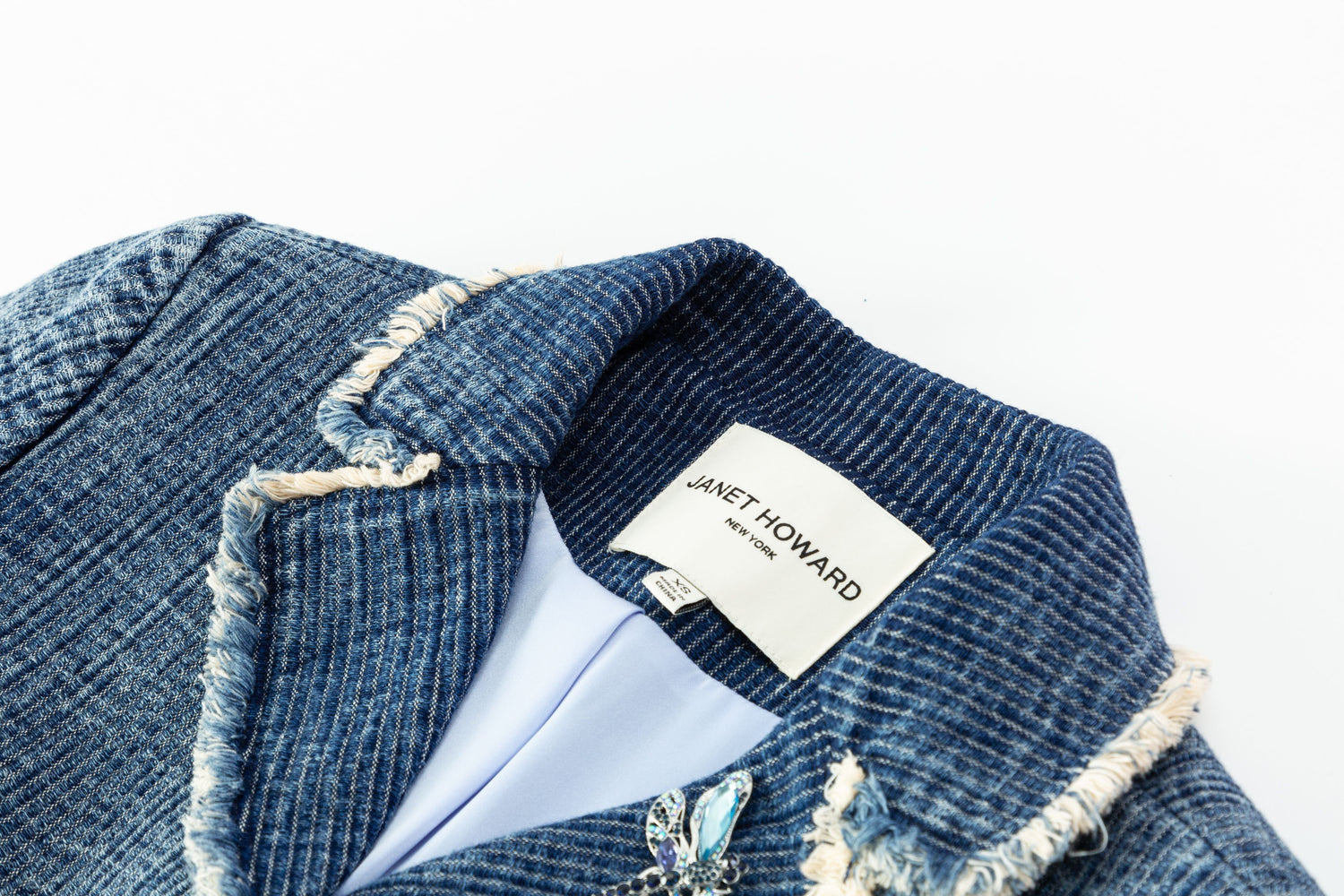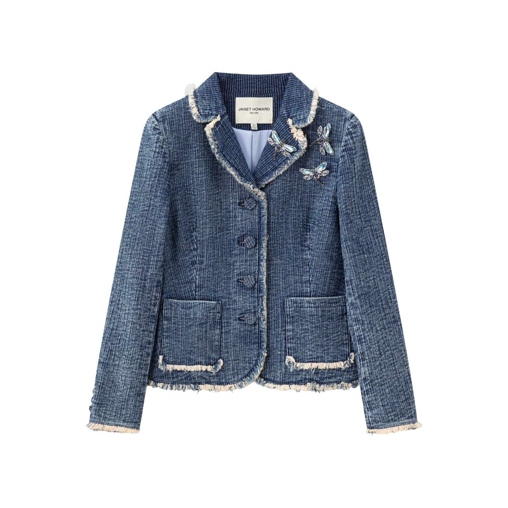 Redefine modern tailoring with this women’s fitted blazer, crafted in washed denim tweed for a refined yet contemporary edge. Raw edge detailing at the notch collar brings subtle attitude, while the tailored waist and structured shoulders create a clean, flattering silhouette. Covered buttons at the front and sleeves enhance its polished finish, complemented by a smooth satin lining for effortless layering. Delicate removable dragonfly pins add a distinctive accent, allowing for personalized styling. Designed to transition seamlessly from day to evening, this blazer pairs effortlessly with tailored trousers, denim, or fluid dresses for an elevated, confident look rooted in timeless structure and modern restraint.
