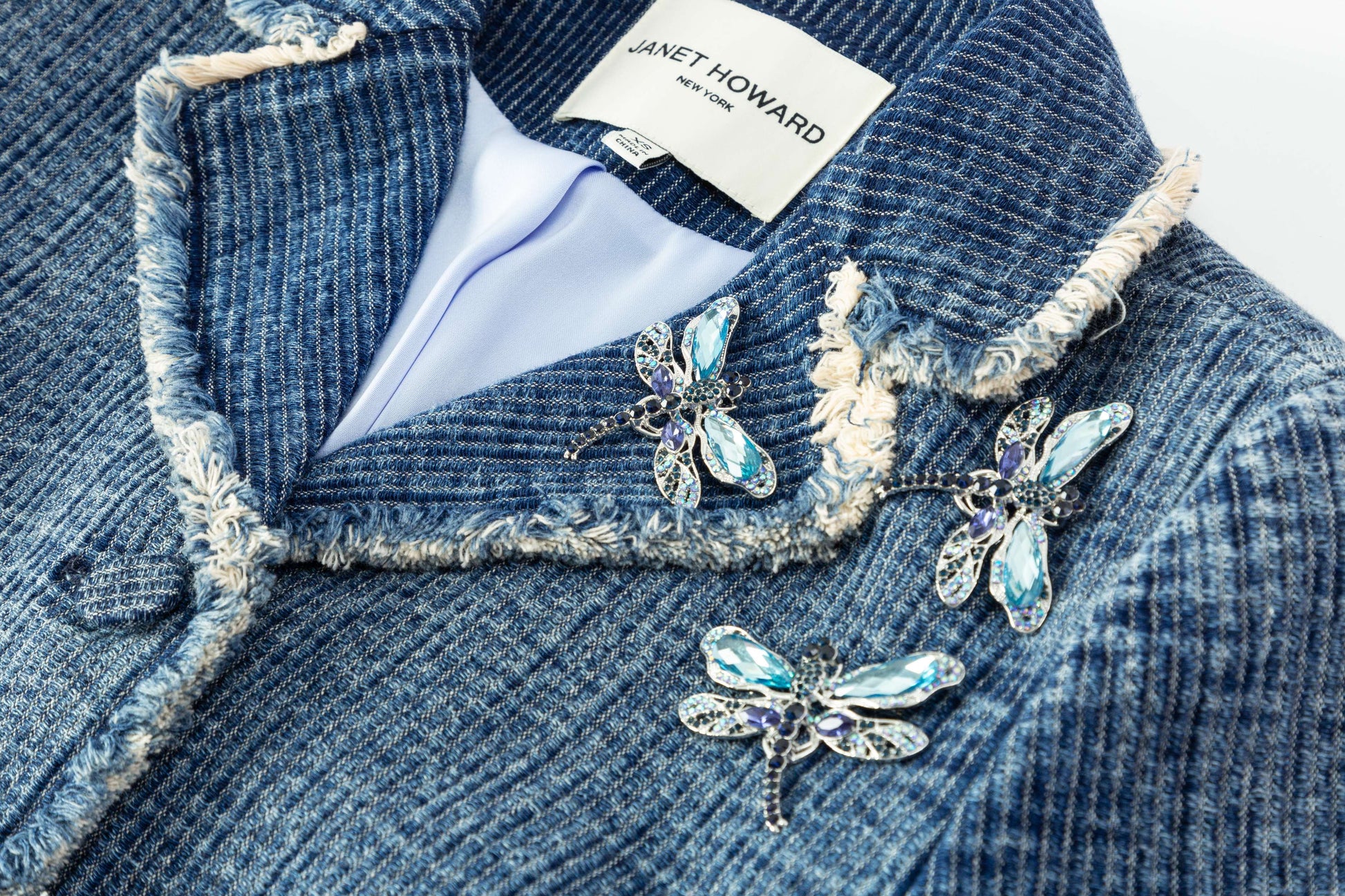 - Three removable dragonfly pins on the lapel and jacket for a playful, customizable accent