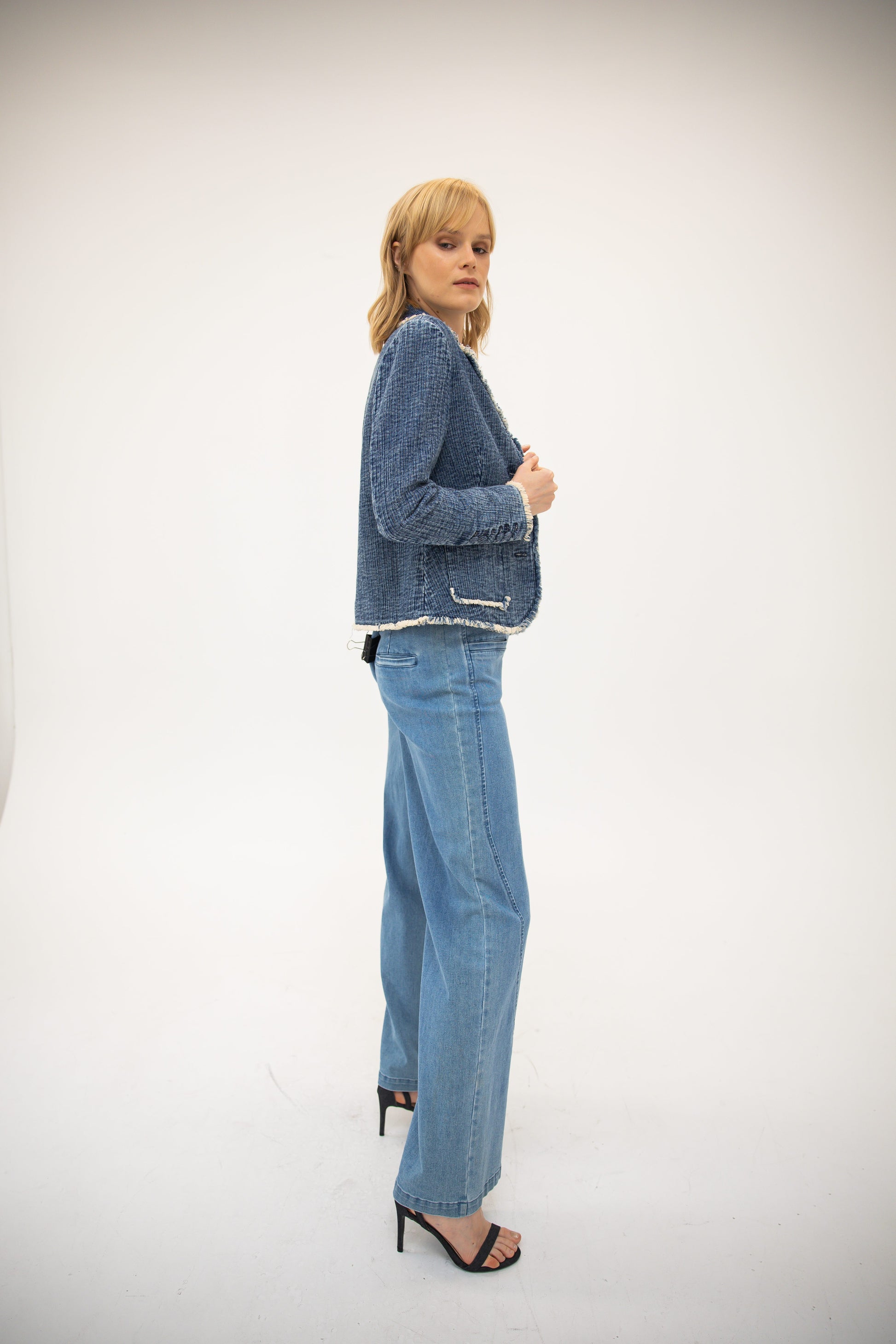 - Structured fit with raw edge details for a modern touch